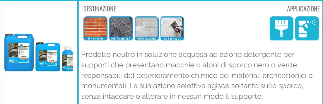 BIO C è un detergente sanificante neutro (pH 7,5 ±0,5) pronto all'uso per rimuovere muschi, licheni, muffe, lieviti e batteri da pietre naturali, intonaci e manufatti storici. Agisce selettivamente sugli infestanti senza alterare il supporto, garantendo pulizia e disinfezione profonda. Resa indicativa 3-6 ml/m² per restauri professionali.