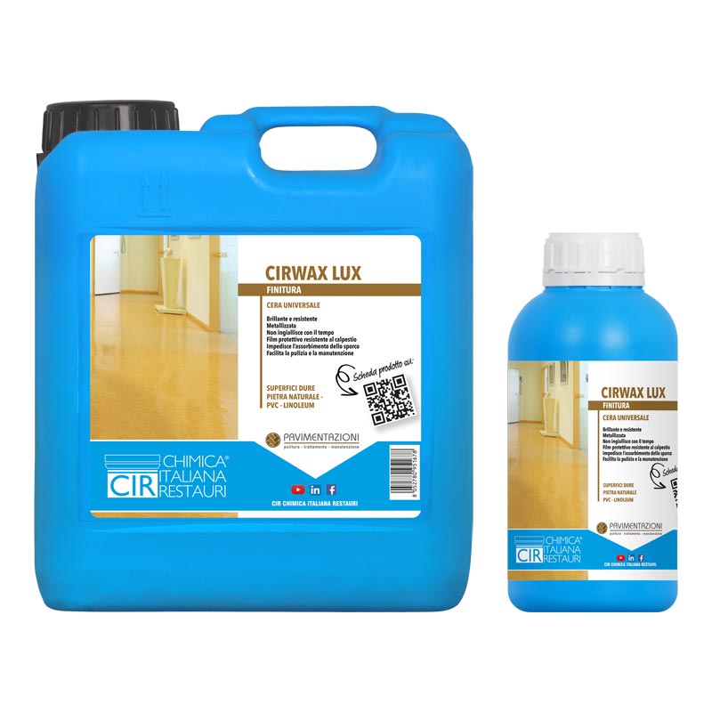 CIRWAX LUX è una cera metallizzata non ingiallente pronta all'uso per pavimentazioni interne in pietra naturale lucidata/levigata, cotto liscio, PVC e linoleum. Crea un film protettivo lucido ad alta resistenza al traffico, uniforma microporosità e facilita manutenzione quotidiana impedendo assorbimento sporco. Resa indicativa 15-20 ml/m².