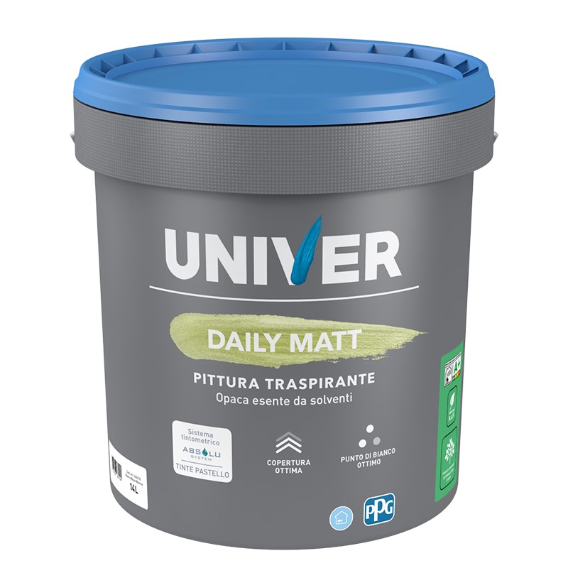 DAILY MATT è una pittura all’acqua per interni traspirante, a basso impatto ambientale, con buon punto di bianco e ottima copertura, perfetta per intonaci, premiscelati, gesso e cartongesso adeguatamente trattati.