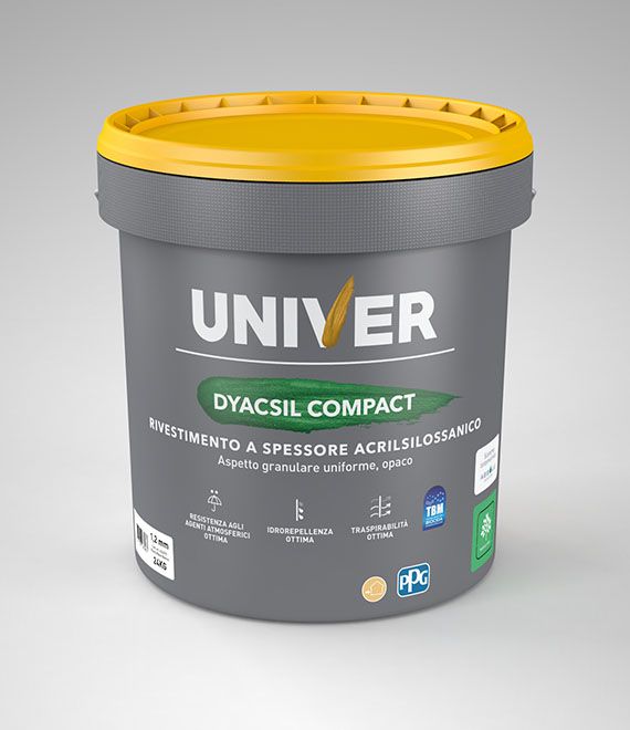 Dyacsil Compact è un rivestimento murale a spessore opaco, a base di resine acriliche e silossaniche, indicato per la protezione di facciate esterne su intonaci bastardi, civili, a base cemento e premiscelati. Grazie alla tecnologia TBM, il film è protetto contro muffe, alghe e funghi con un rilascio graduale dei principi attivi, assicurando lunga durata e resistenza alle aggressioni atmosferiche.