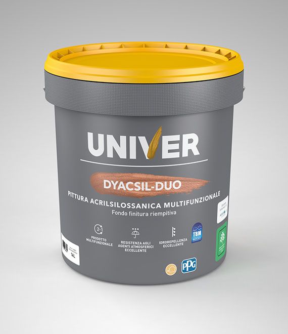Dyacsil Duo è un fondo-finitura riempitiva in fase acquosa, progettato per la protezione duratura di facciate esterne. La formulazione acrilsilossanica con biocida microincapsulato assicura una barriera efficace contro muffe e alghe, garantendo traspirabilità, idrorepellenza ed elevata resistenza agli agenti atmosferici. Idoneo per intonaci bastardi, civili, cemento e premiscelati.