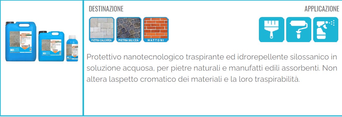 Categoria: Protettivo idrorepellente | Tecnologia: Silossani oligomeri nanotecnologici in base acqua | Conformità: Reversibile, SDS 16 sezioni