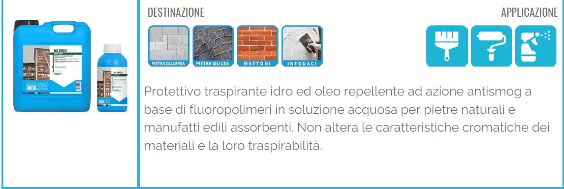 NO SMOG è un protettivo idro-oleorepellente traspirante a base acqua, specifico per pietre naturali e manufatti edili assorbenti, anche di interesse storico-artistico. Impedisce la penetrazione di acqua, sali, smog e sporco grasso, facilitando la pulizia easy to clean senza alterare traspirabilità, colore o aspetto. Ideale per manutenzione preventiva su supporti porosi.