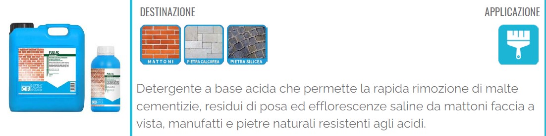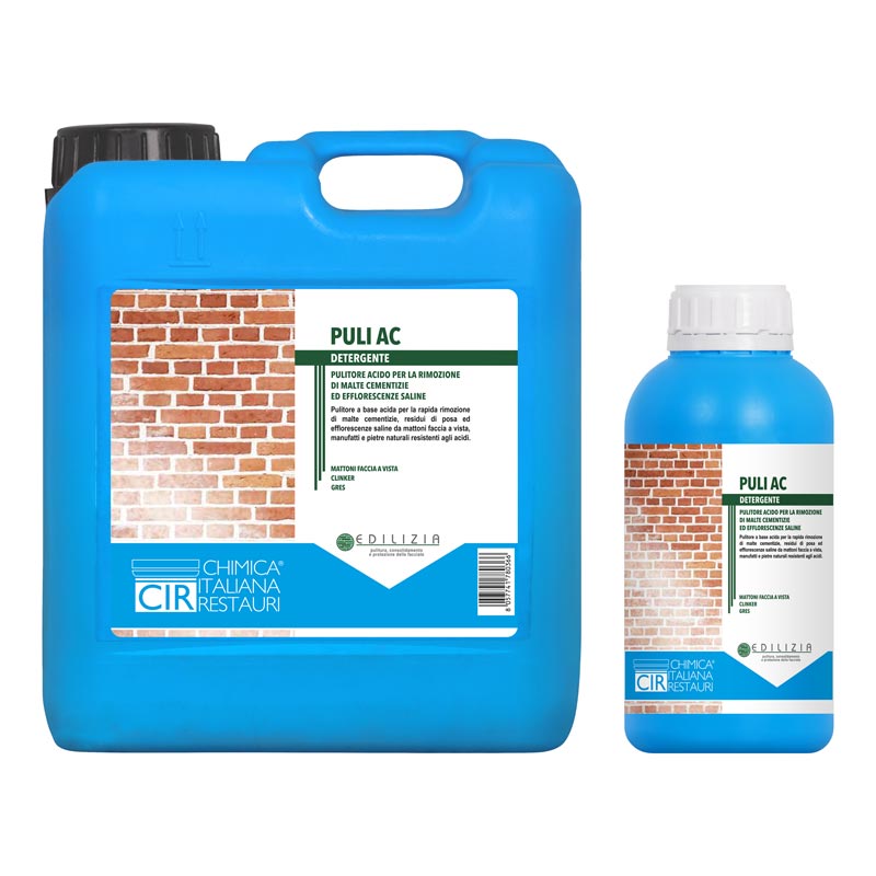 PULI AC è un detergente acido specifico per la rimozione di malte cementizie e efflorescenze saline da mattoni faccia a vista, pietre naturali resistenti agli acidi, gres, clinker, cemento e superfici ceramiche. Formulato per agire efficacemente in concentrazione diluita, permette un pulito selettivo senza danneggiare i materiali trattati.