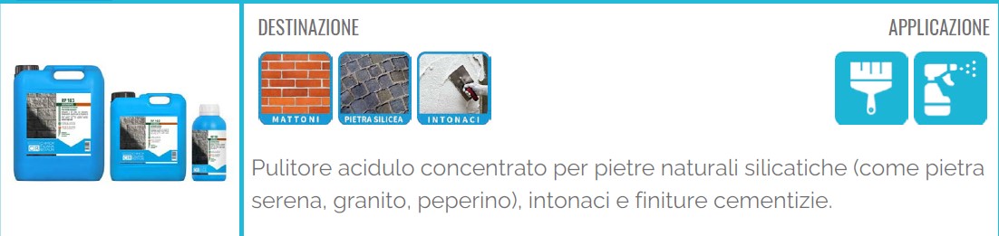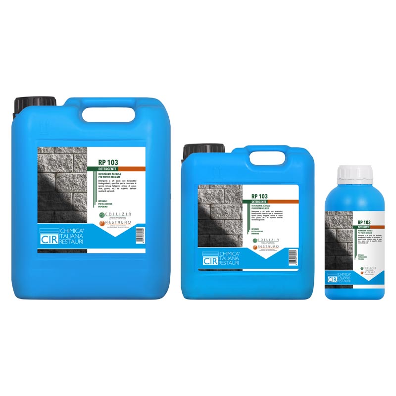 R: RP 103 è indicato per pietre silicatiche delicate resistenti agli acidi, come peperino, pietra serena, granito e sienite; non va applicato su superfici non resistenti agli acidi, per le quali è necessario eseguire sempre prove preliminari.