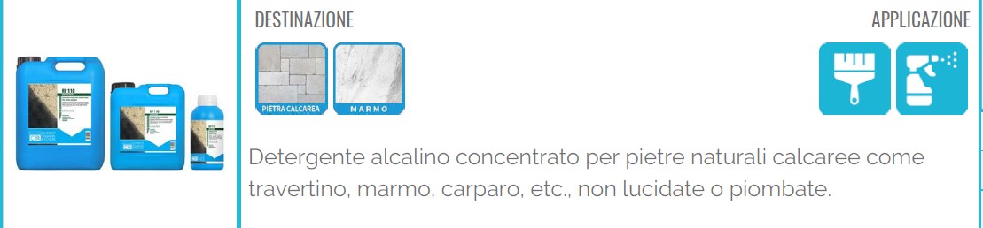 RP110 è un detergente alcalino concentrato (pH 13 ±0,5) specifico per la pulizia di pietre naturali calcaree non delicate come marmi, travertini, calcari e carpari. Rimuove rapidamente sporco organico e inorganico, smog, fuliggine, guano, grassi e strisce di acqua dura, preservando l'aspetto del supporto. Ideale per restauri professionali con resa indicativa 6-18 ml/m².