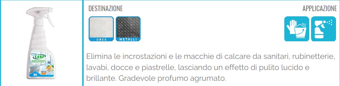 SANI DISINCROSTANTE è un detergente disincrostante specifico per la rimozione di residui e incrostazioni di calcare da rubinetterie, lavabi, docce e piastrelle in ambiente bagno. È pronto all’uso, agisce rapidamente sulle incrostazioni e restituisce alle superfici l’aspetto originale, con effetto pulito lucido e brillante e gradevole profumo agrumato.