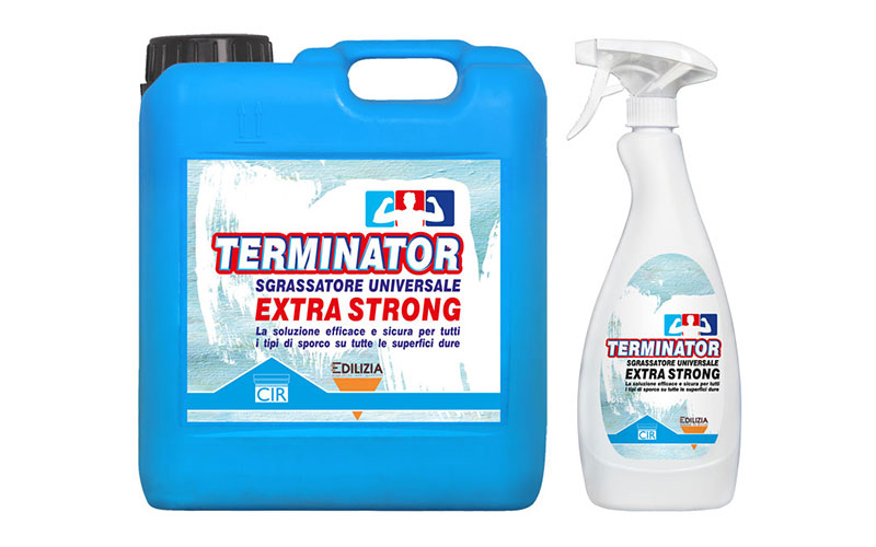 TERMINATOR è un detergente sgrassatore universale spray per superfici dure come metalli, vetro, pietre naturali, piastrelle in gres, ceramica, klinker, pavimenti e plastiche. Rimuove efficacemente sporchi organici, grassi, olii, inchiostri, residui vernice, fuliggine, gomma e adesivi senza alterare aspetto o consistenza. Non lascia aloni, ideale per pulizie professionali con resa 10-20 ml/m².