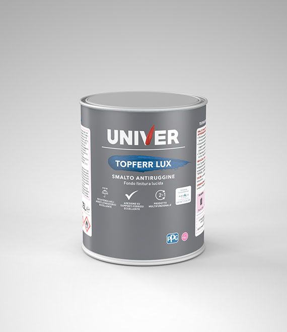 Categoria: Smalti antiruggine | Tecnologia: Fondo finitura lucida tissotropica | Conformità: Resistenza ruggine e agenti atmosferici