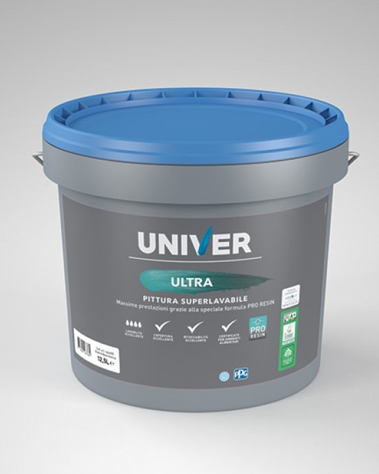 ULTRA è una pittura per interni con finitura opaca profonda, caratterizzata da eccellente copertura e alta lavabilità. La sua formula innovativa garantisce applicazione uniforme e alta ritoccabilità. Può essere applicata senza primer su supporti in buone condizioni, ideale per ambienti con alto standard igienico, anche alimentari.